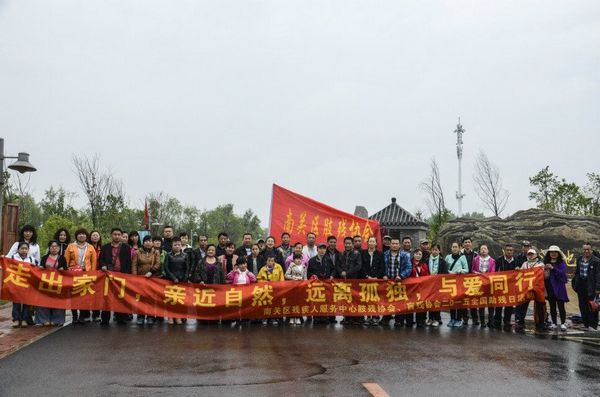 上午,天空下着毛毛细雨,组织者为每名残友都赠送了雨伞,空气清新怡人,北湖公园游人比平时少了许多,残友们难得一聚,心情十分兴奋。大家问候着,说笑着,交流着。在北湖大门口大家首先拍了合照,一条长长的横幅上写着十六个大字“走出家门,亲近自然,远离孤独,与爱同行”,表达了广大残友们的心声。大家都渴望与大自然来个零距离接触,感受微风的拂面,感受绿草的芬芳。这些在健全人那里很简单的事,对一些残友来说却是不易得到的,大家非常珍惜这次聚会的机会。
