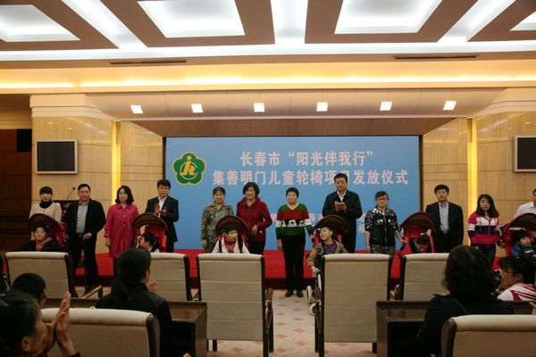 图为长春市“阳光伴我行”集善明门儿童轮椅项目发放仪式