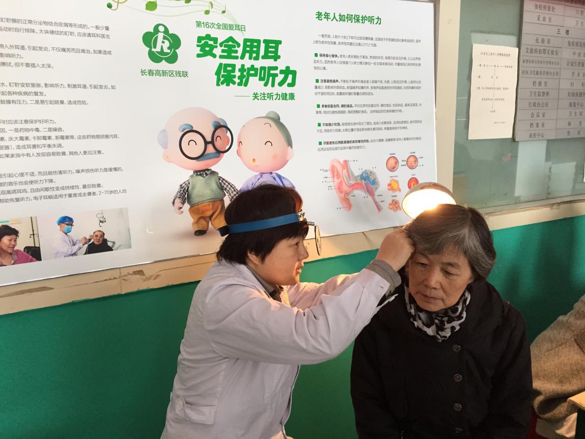 图为耳科专家免费为居民检查听力和前庭功能